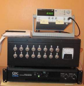 - Capacitor box. This piece was custom made and has several capacitors that can be turned on and off so that the frequency generator can transform the 60 Hz coming out of the wall socket to the frequency I want. Among my friends, it is known as the “flux capacitor.”