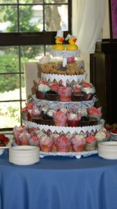 I decided in advance that I wouldn’t have a wedding cake that I was unable to eat. Joe and I decided on cupcakes. That way there would be several flavors, one of which we could share (and he could have his favorite flavor, too). Miraculously, my sister came up with a recipe with no food allergens in it (try baking with no flour, corn starch, potato flour, eggs, butter or anything else that makes a cake a cake). I call it the lemon coconut miracle. Then we rented a cupcake stand. When it showed up, I had no energy or creativity left to think about it. Four of my friends (all of whom I consider sisters, one of whom was related by blood) took over and turned it into a masterpiece.
