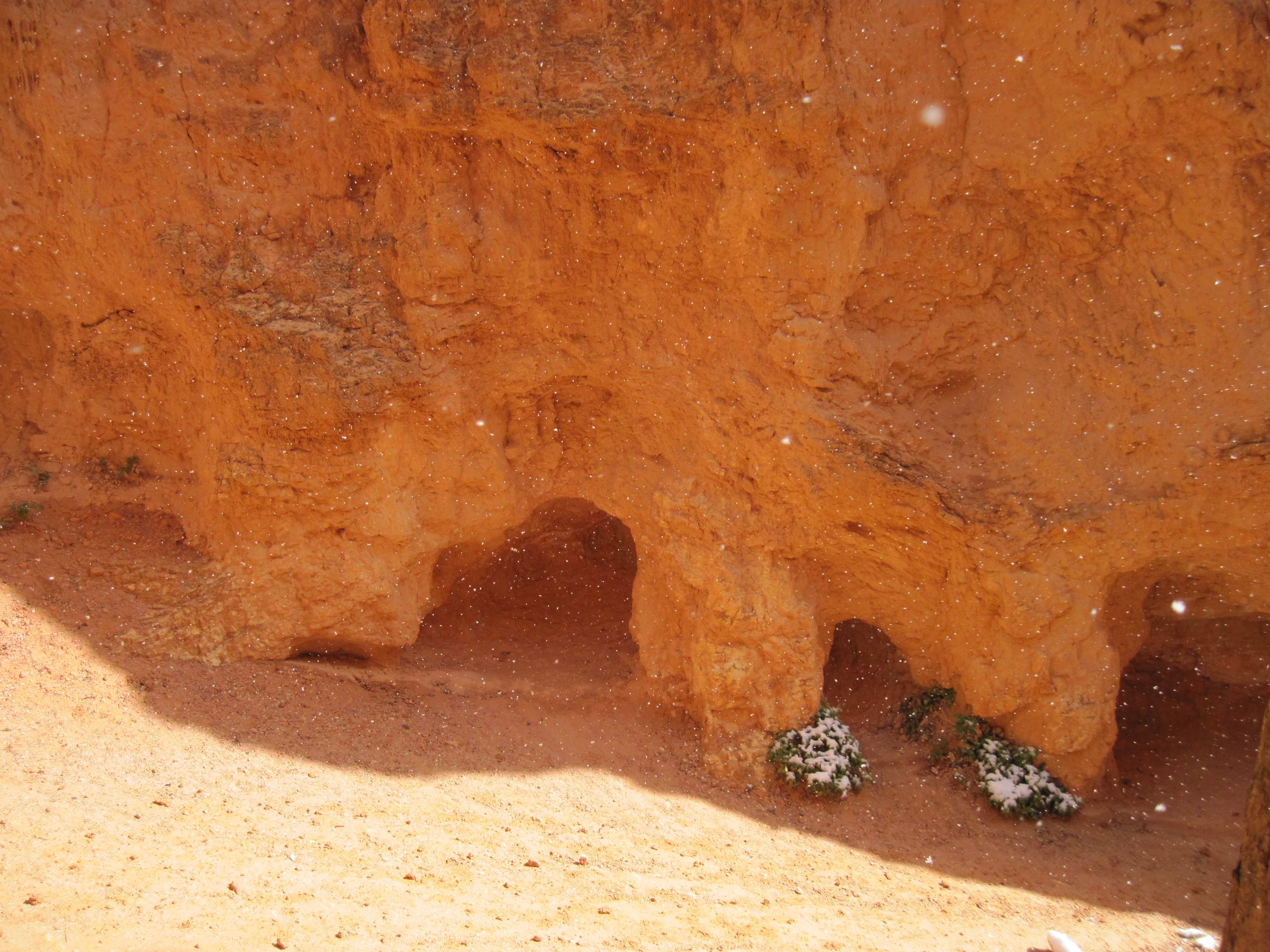 The Bryce Canyon area is covered in snow. We went on a hike on the Navajo Trail, down into the canyon, in the snow and bright orange mud. The whole world seemed to be glowing beautiful shades of orange. I felt more in control of my legs than I have thus far during the trip. (This was fortunate because some of the downward path was slippery.)
