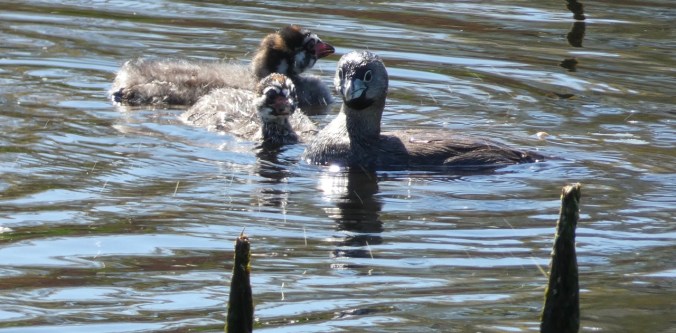 Despite the limitations, I’ve been crocheting and going for long walks with the dogs. When I don’t have the dogs, I go for shorter walks with a camera. I’ve been watching the birds nesting in the nearby slough this spring and summer. First eggs, then chicks, then fledglings (if those terms apply to waterfowl). The pied-billed grebes are so cute. They are still in their first molt, but they’re swimming around.